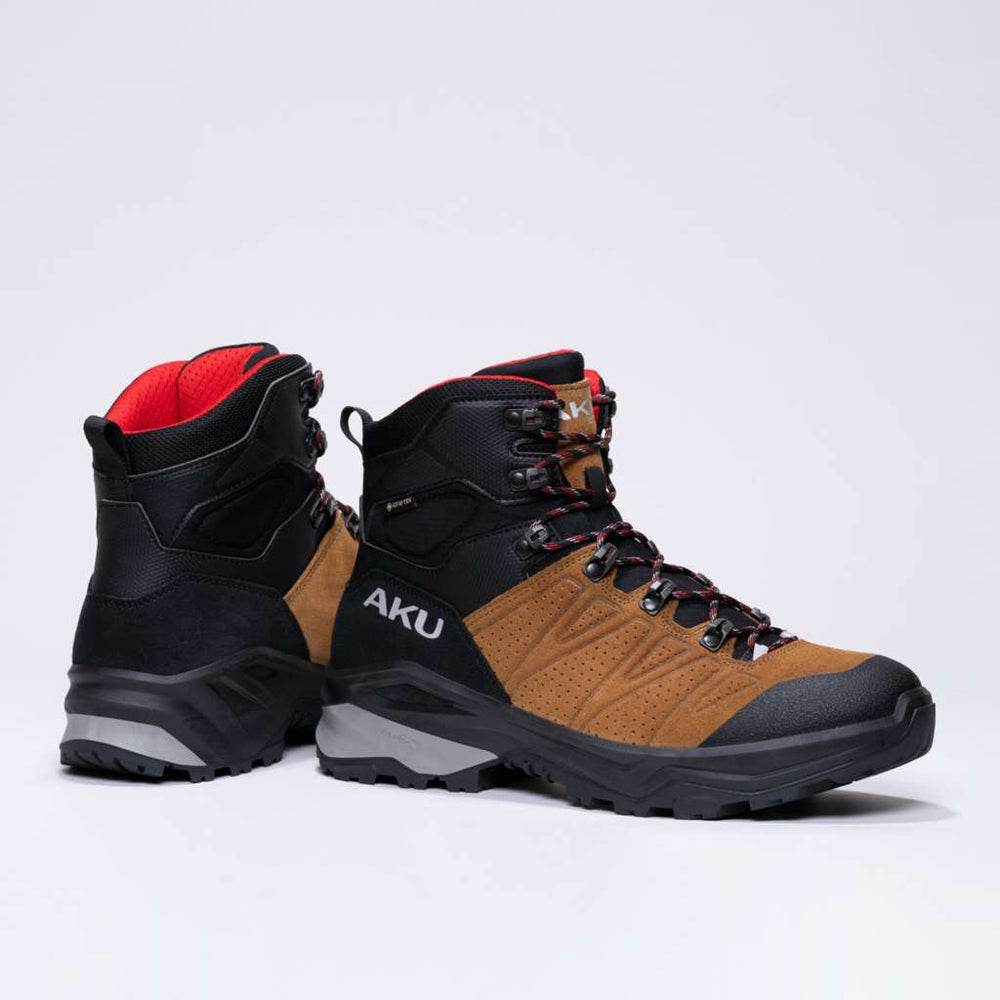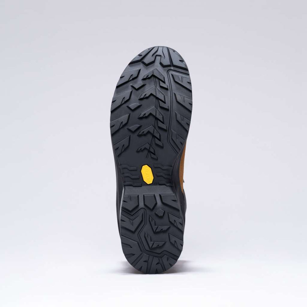 Dynamic mid-altitude trekking model. Suede and stretch fabric upper, construction without gussets for maximum comfort. Vibram sole with asymmetric design and grooves in the support and thrust areas that allow adaptation to the morphology of the terrain and maximise the dynamic effect of the AKU Elica Natural Stride System to promote biodynamic efficiency. Direct injection polyurethane wedge with differentiated density to copy the plantar anatomy of the Elica last and provide cushioning and support. Made in Italy.