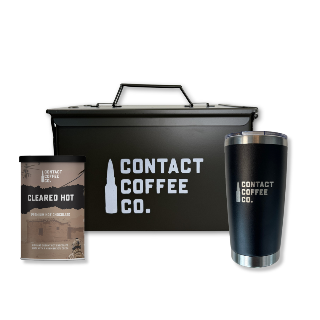 A rich, full-bodied hot chocolate made with a minimum of 30% cocoa. It delivers a bold, morale-boosting warmth that’s more than just a comfort drink, it’s your go-to when you need something stout and satisfying. Mix it with milk for creaminess, or with hot water for a lighter but still powerful cup. Use it as the base for a mighty mocha by adding a shot of strong Contact Coffee. -