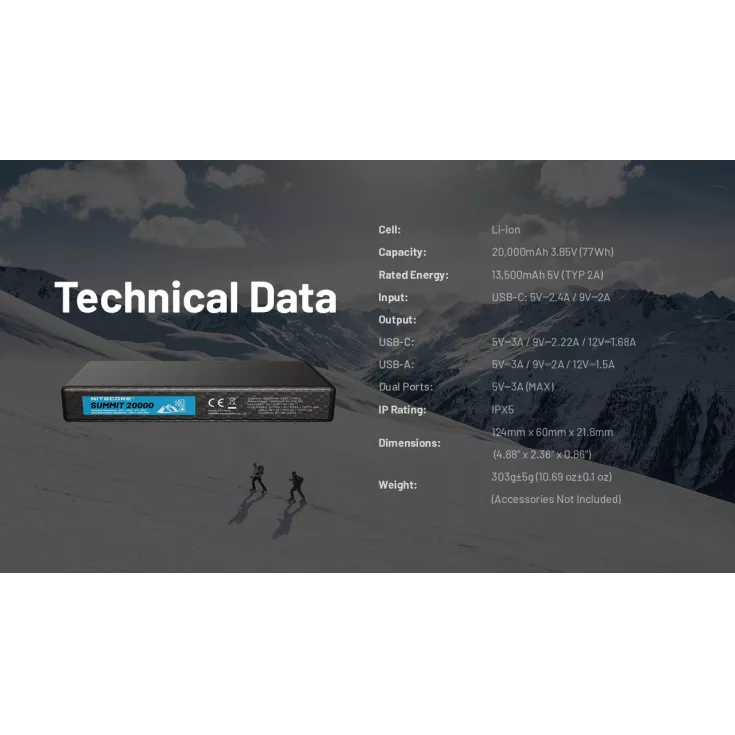 Designed for adventurers aiming to conquer the summit, the Nitecore Summit 20000 is perfect for mountaineering, polar exploration, time-lapse photography, skiing, and other winter sports. Its unibody carbon fibre shell offers superior protection without splicing, making it both resilient and compact at just 303g.