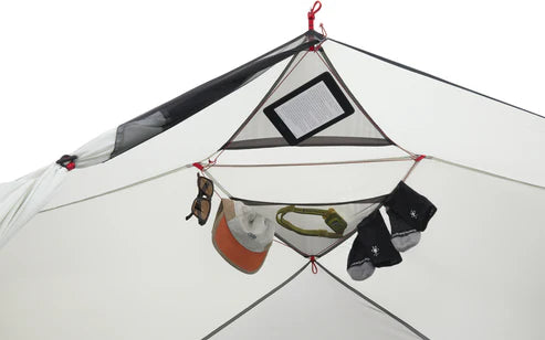 The Inside: The interior is a roomy 20 sq. feet (1.82 sq. m) with no taper to accommodate modern rectangular sleeping pads, plenty of room to relax and wait out the elements. The tent body is mostly solid nylon fabric for maximum weather protection, with just enough solution-dyed micromesh for breathability and bug protection. A durable, no-curve tent door feature zippers that are easy to use with one hand. They also zip close to a single point, so you always know where to open the door, even in the dark. Tech-friendly pockets feature cable ports at the corners for headphones and charging cords. A large overhead gear loft pocket is perfect for a headlamp, sunglasses and other quick-access items, and an included clothesline lets you dry out damp clothes.
